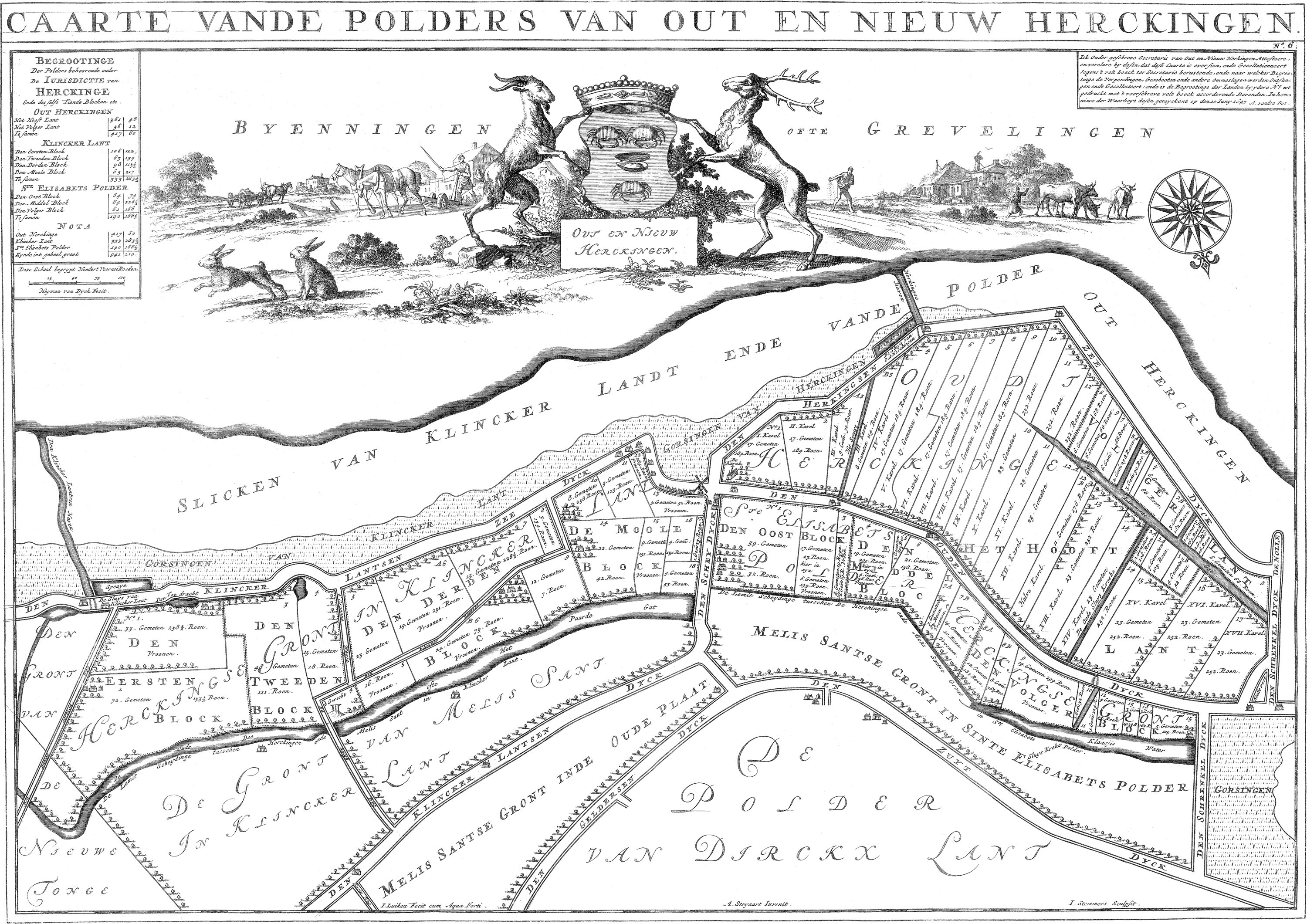 Caarte vande Polders van Out en Nieuw Herckingen. Uitgave 1695. Behorende tot het Caartboeck van Voorne, voor het eerst uitgegeven in 1695. Vervaardigd door: Heyman van Dyck. Gegraveerd door: Jan Luyken. Heruitgave 2001, Uitgeverij De Klokkestoel, Oostvoorne. |