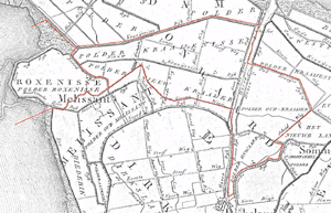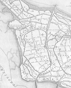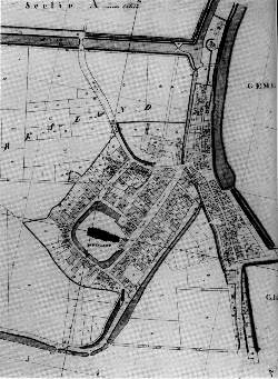 | Uitsnede uit een Kadastrale minuut van Dirksland uit 1825. Overgenomen uit het boek: Bodemvondsten uit Goeree-Overflakkee, uitgave 1994. |