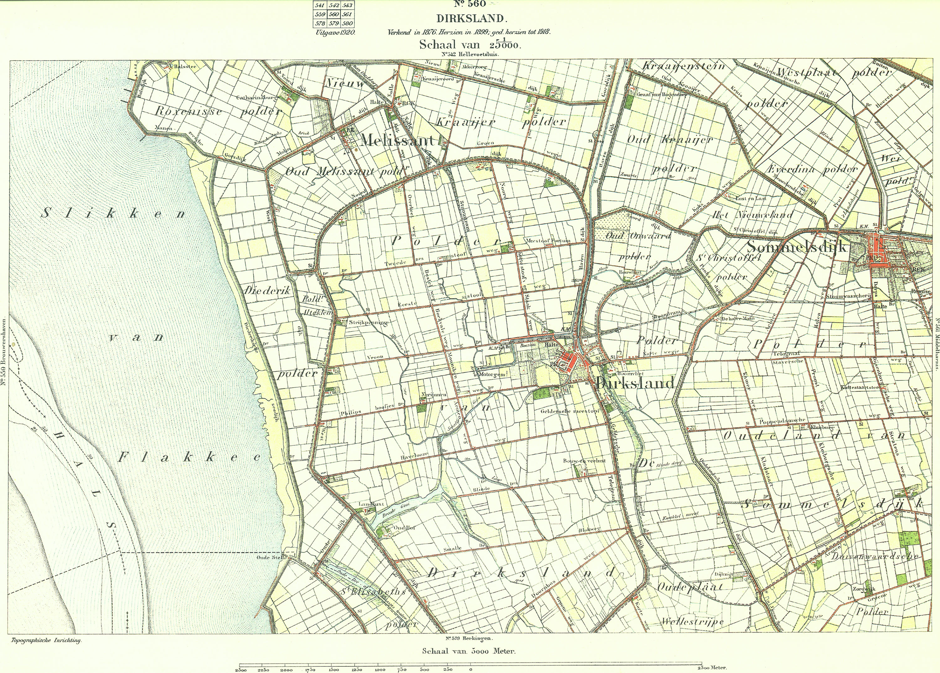 | Chromotopographische Kaart van Nederland, schaal 1:25.000, blad 560, Dirksland. Uitgegeven in 1920. Verkend in 1876. Herzien in 1899; gedeeltelijk herzien tot 1918. Vervaardigd door: het Topographisch Bureau. |
