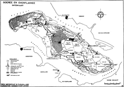 | Kaart van het Inundatiegebied Goeree en Overflakkee 1944-1945. Behorende bij het boek Verdrinkend Land. Uitgave 1945. |