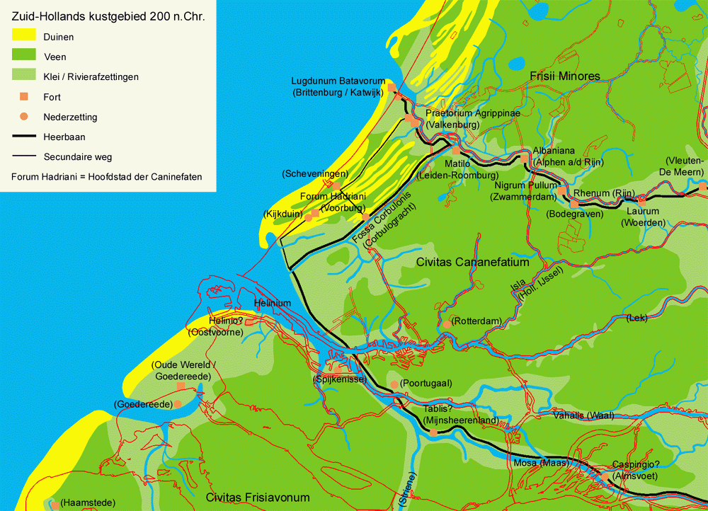 | Zuid-Hollands kustgebied. Situatie in 200 n.Chr. Door de samensteller van deze site getekend naar voorbeeld van een kaart van het Hollands kustgebied. Verschenen in het boek: Geschiedenis van Holland, deel 1, uitgave 2002. Origineel: Jos Bazelmans en Menno Dijkstra, bewerking Cartografisch Bureau MAP, Amsterdam. |