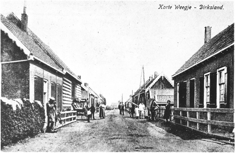 Het Korteweegje in de richting van de Oudelandse-dijk. Ook nu valt weer op dat de weg nog niet bestraat is, tijdens de bietentijd was het een echte modderpoel.