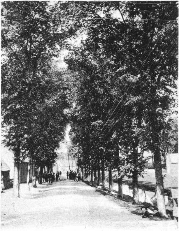 Het Schelpenpad in de richting van de Kaai. Aan het eind rechts staat een weeghuisje. Rechts ligt het Spui. De bomen zijn tegenwoordig verdwenen, evenals de bovengrondse telefoonlijnen. De foto is begin 1900 genomen.