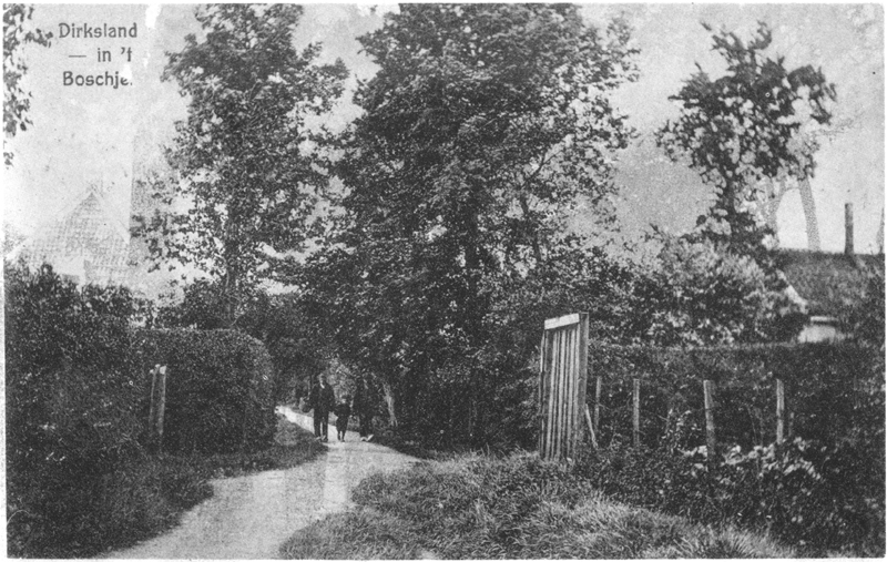| Foto 47 Een zeldzame foto van het "Boschje", vroeger voor kunstschilders een geliefd punt. Het was indertijd een der mooiste wandelwegen van Dirksland. Op de plaats van het pad op de voorgrond loopt thans de B.C. Zaaijerlaan, terwijl het pad wat naar de achtergrond wegloopt thans de Bosdreef is. |