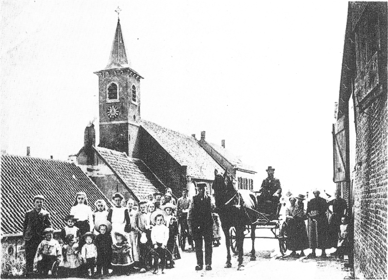 De Nederlands Hervormde Kerk aan de Scharloodijk, met ernaast de pastorie. De kerk is in 1788 gebouwd, voorheen werd de godsdienst uitgeoefend in een schuur aan de Kaaidijk.