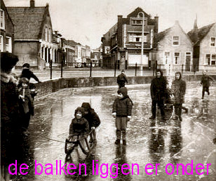 Piet van den Tol met er naast de tuin van de dames de Graaf. Dan de poort van de tuin van Notaris Kostermans van de Voorstraat. De Voorstraat was de straat waar de notabelen woonden, daarom zal de Nieuwstraat indertijd wel den Achterweg genoemd zijn, waar hun tuinen en schuren op uitkwamen. De timmermans werkplaats van Piet van Ek was in mijn herinnering groot. Het was een imposant gebouw, er stond een grote dieselmotor met een drijfwerk, wat op zijn beurt weer de verschillende houtbewerkingmachines aandreef. Later is deze dieselmotor vervangen door een grote elektromotor die in driestappen op snelheid kwam en het dan uitzong, een machtig geluid (nu zou je zeggen geluidoverlast). Maar hij deed nog meer, wat voor ons kinderen van groot belang was. Als het ging vriezen hield hij met een paar mannen het ijs op de Kerkgracht in de gaten en legde dan stiekem 's nachts met een paar mannen "balkers" onder het ijs zodat we veilig konden schaatsen. Er werd ons verteld als Piet van Ek de balkers er onder heeft gedaan is het ijs veilig. |