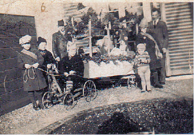 Het verschil werd met lood gecompenseerd in een uitholling onder in het gewicht. Piet van Ek de timmerman, had daarnaast een grote opslagloods van hout, het hout werd met de beurtschippers Waling of de Graaf van uit Rotterdam in de haven aangevoerd en op de kaai gelost. Er naast de achteruitgang van Labeur die naar het woonhuis aan het Achterdorp ging en nog gaat. Het was de enige achteruitgang die het Achterdorp aan die kant had. Dan waren er in die tijd twee garages door Dingeman Braber gebouwd, één werd door Bert en Riek Zoon als groente hal gebruikt, waar ze hun handel in deden. Braber gebruikte er zelf één voor zijn DKW auto en zijn motor, een Panter, deze motorfiets heeft hij in de oorlog verstopt en is ongeschonden de oorlog door gekomen (de merken meen ik mij te herinneren). Hun woonhuis was aan den Achterweg en de winkel in de Winterstraat, Henk en Bastie waren onze leeftijdgenoten. Met Henk Braber speelden Leen Labeur en ik ook regelmatig. Henk had een "vliegende Hollander", waar in 1938 met de geboorte van prinses Beatrix een aanhanger achtergemaakt werd en wij zo met de optocht door het dorp mee konden rijden. Mijn vader en meester Immerzeel hebben hem in elkaar geknutseld. Meester Immerzeel maakte een mooie ooievaar van triplex, een rietenmand werd zijn nest, zijn staart is net nog te zien op onderstaande foto. Prinses Beatrix lag als pop in een oude kist van een Mc.Cormick zelfbinder wat tot wiegje omgetoverd was. Een paar papieren mutsen op, een sjerp en klaar was kees. Henk moest trappen en wij helpen trekken en zo reden wij mee in de optocht. |