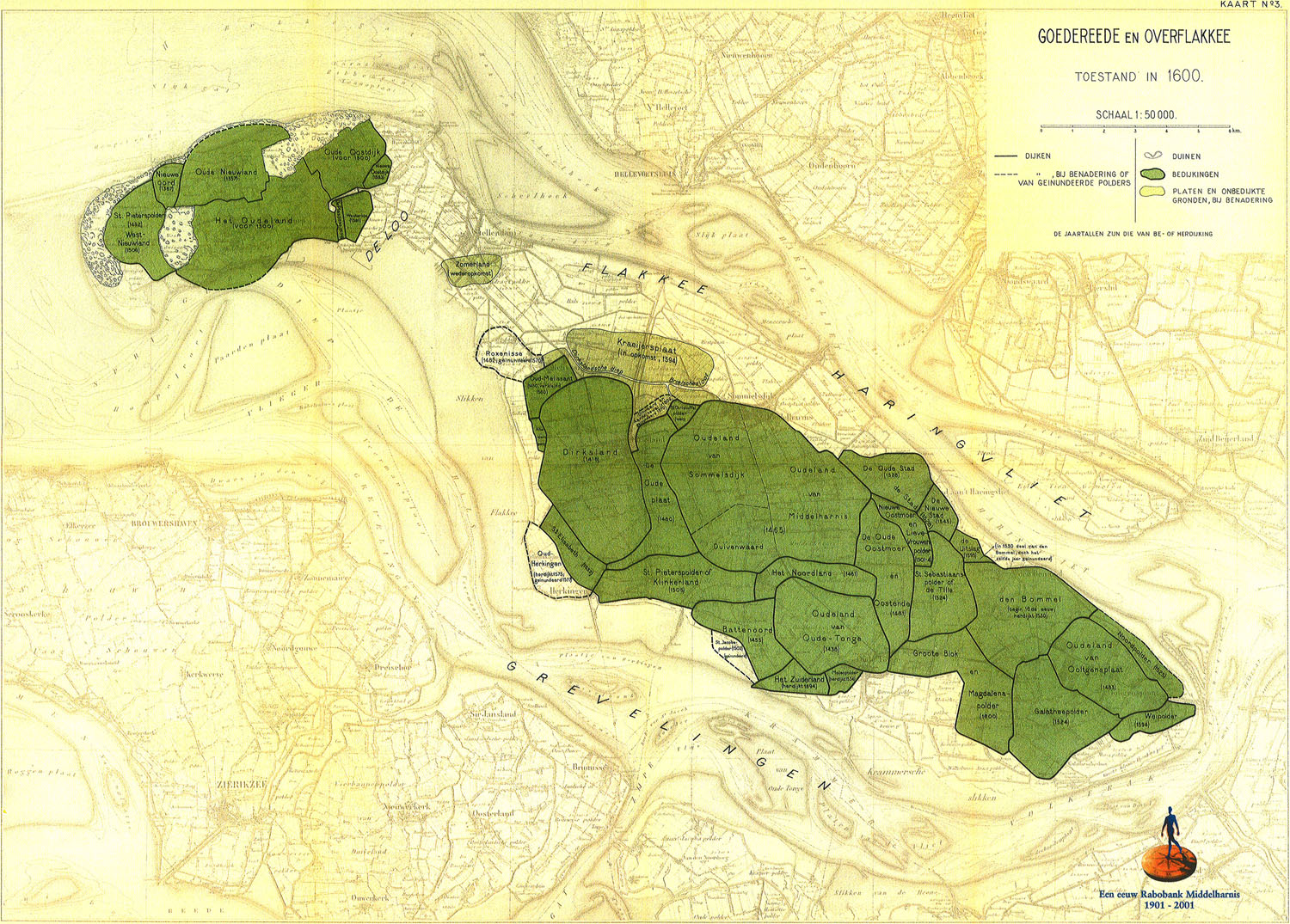 De ontwikkeling van Goeree-Overflakkee. Situatie in 1600. In 2001 heruitgegeven door Rabobank Middelharnis. Origineel behorend bij; De waterkeeringen, waterschappen en polders van Zuid-Holland - deel X, Jhr. L.F. Teixeira de Mattos, uitgegeven in 1941. |