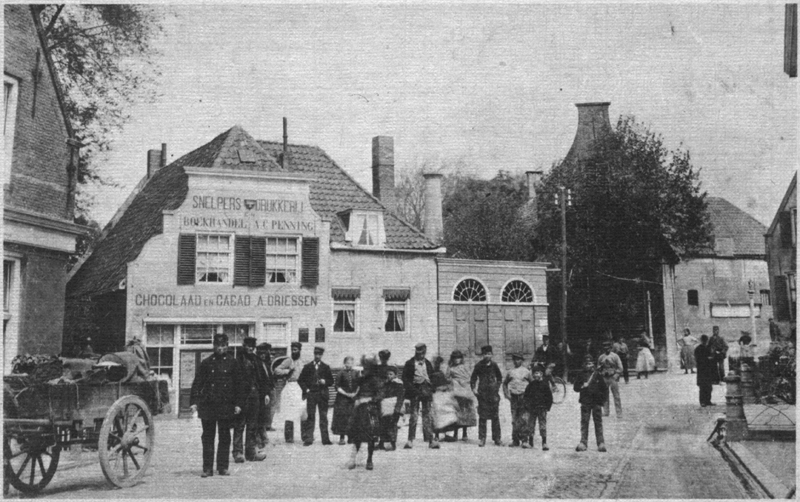 Zicht op Winterstraat en Heul, de mensen staan aan het begin van de Voorstraat. Rechts naast "Snelpersdrukkerij en Boekhandel A.C. Penning", met de halfronde ramen, het "brandspuithuisje".