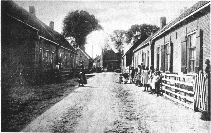 | Foto 1 De entree van Dirksland, het Korteweegje. Nog duidelijk te zien zijn de karrensporen. Het huis waar men recht tegenaan kijkt, aan het eind van de weg, staat aan het Schelpenpad en is tegenwoordig afgebroken, ter plaatse staat nu een elektronica zaak. |