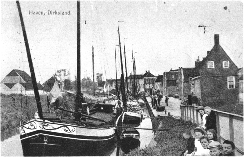 Een volle haven van Dirksland. De foto is vanaf de trambrug in de richting van het dorp genomen. Rechts de thans verdwenen panden tussen Molendijk (West-Havendijk) en Kaai.