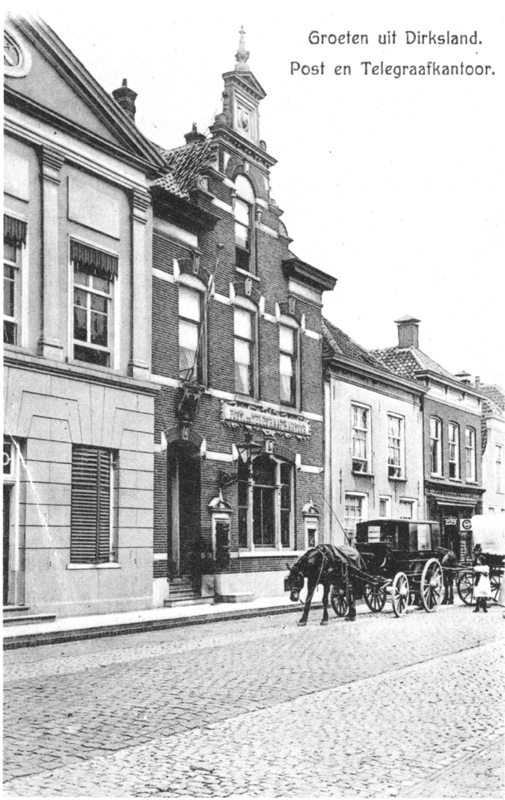 | Foto 14 Het post- en telegraafkantoor. Dit pand stamt uit 1570, maar is in de 19de eeuw grondig verbouwd, waarbij de originele gevelsteen is weggenomen. Links daarnaast het Gemeentehuis. Helaas is het postkantoor voor de nieuwbouw van het Gemeentehuis in de 20ste eeuw gesloopt. |
