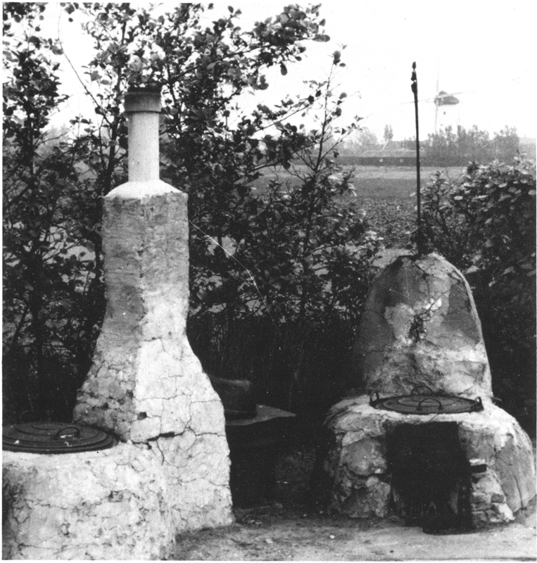 Twee oude stookplaatsen bij de watermolen, die in 1955 zijn gesloopt. Op de achtergrond korenmolen "De Eendracht".