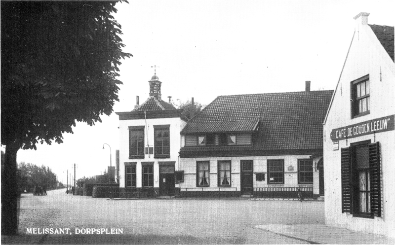 | Bladzijde 67, Melissant. Het Plein, het gebouw naast het raadhuis met torentje schijnt vroeger een klooster geweest te zijn, alsmede een kerk voor het katholieke deel der bevolking. Later is dit gebouw een openbare school geworden tot 1880, toen er een nieuwe school bij de Hervormde kerk gebouwd werd. Rondom het huis zijn bij werkzaamheden graven ontdekt, zelfs in één van de kamers van dit gebouw. |